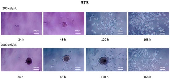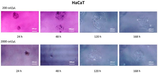Concerning the HaCaT cell line, the spheroids seemed to lose the compact structure and appeared with a more diffuse morphology as a consequence of their mode of growth in discrete patches [32]. The time increase gave way to cell patches compatible with standard epithelial cell growth. Diameters ranging up to 2.5 and 3.0 times the dimensions of the spheroids at 24 h after the recovery were found for 200 and 2000 cel/µL, respectively (Supplementary Materials, Figure S1b).