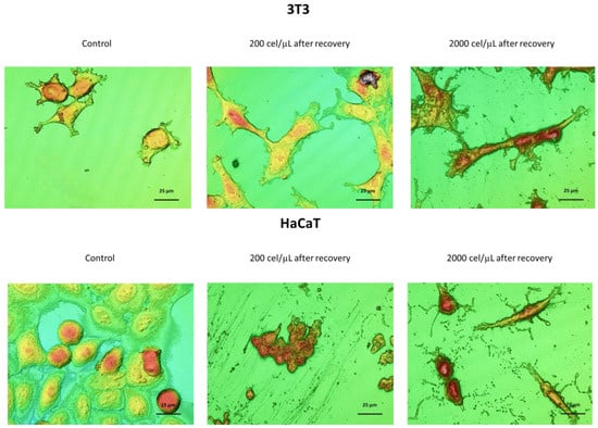 Although these results have demonstrated that the recovery process did not induce dramatic modifications, the absence of statistical significance in size distribution after and before the recovery, especially in the case of spheroids formed at the lower cell density, might be related to the cells involved. In this sense, it is known that tissue-resident fibroblasts are mesenchymal cells that possess impressive plasticity in their ability to modify their properties according to the requirements the microenvironment [29]. This characteristic could explain changes in the size distribution of the 3T3-derived spheroids during recovery. On the other hand, the mutations in both alleles of p53 in HaCaT cells suggest a mechanism for their immortalization and inherent phenotype [30], resulting in less sensitivity to possible changes induced during recovery.