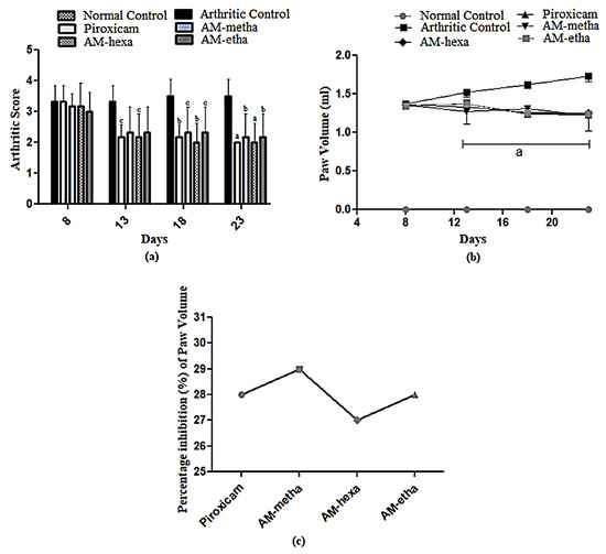 Arthritic index and paw volume. (a) c p < 0.05, b p < 0.01, and a p < 0.001, and (b) a p < 0.001 when other group values were compared with arthritic control; (c) % inhibition when compared with the arthritic control. The highest percentage inhibition was shown by the AM-metha group.