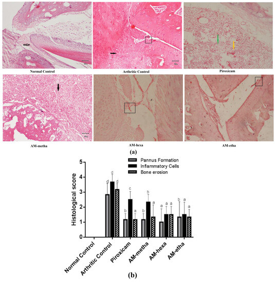 AM-metha extract, AM-hexa fraction, AM-etha fraction, and piroxicam displayed reduction in erosion of bones, inflammatory cell infiltration, and pannus formation in comparison with the arthritic control. The normal control showed normal bone and a normal synovial layer (black arrow); the arthritic control showed marked pannus formation (black arrow) and eroded cartilage (rectangular); piroxicam showed fibrosis formation (green arrow) and moderate infiltration of inflammatory cells (yellow arrow); AM-metha displayed moderate pannus formation (black arrow); AM-hexa showed eroded bone at the level of the joint (rectangular); and AM-etha showed mild erosion of joint cartilage; see Figure 2a,b.