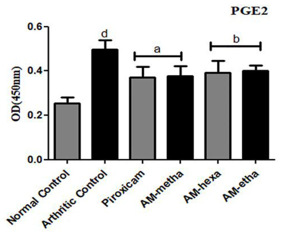 PGE2 protein level. AM-meth, AM-hexa, and AM-etha decreased the levels of PGE2 as compared to the arthritic control group. Here, a p < 0.001 and b p < 0.01 are compared to the arthritic group, whereas d p < 0.001 shows the comparison between the normal control and arthritic groups.