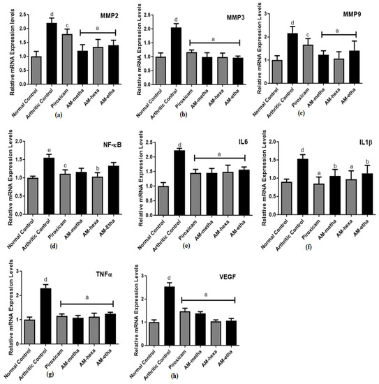AM-metha and AM-hexa prominently reduced the expression levels of (a) MMP2, (b) MMP3, (c) MMP9, (d) NF-κB, (e) IL6, (f) IL1β, (g) TNFα, and (h) VEGF, while AM-metha and AM-etha showed a non-significant reduction in NF-κB expression levels as compared to the arthritic control group. Here, a p < 0.001, b p < 0.01, and c p < 0.05 are compared to the arthritic group, whereas d p < 0.001 and e p < 0.01 shows the comparison between the normal control and arthritic groups.