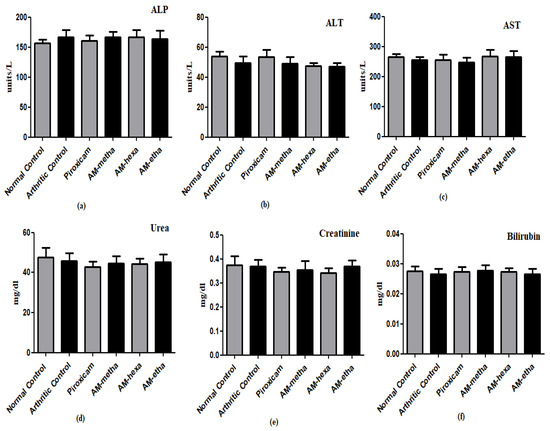 The arthritic control group showed reduced hemoglobin content and RBC counts as compared to the normal control. Treatment with AM-metha, AM-hexa, AM-etha, and piroxicam showed elevated Hb content and RBC counts. A significant elevation in platelet and WBC counts was observed in arthritic control rats as compared to normal control rats, respectively. AM-metha, AM-hexa, and AM-etha groups displayed a reduction in the levels. The attenuation was also seen in piroxicam-treated rats (Table 3). The levels of ALP, total bilirubin, creatinine, urea, AST, and ALT were also evaluated in the current study and a statistically non-significant difference was detected among all groups when they were compared with each other (Figure 5).