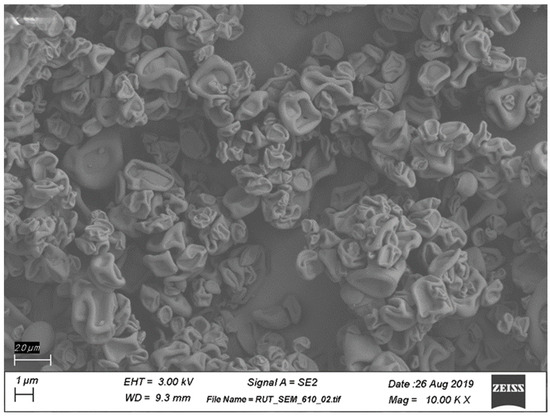 A DPI product of RV94 was generated using an optimized spray-drying process and formulation that demonstrated good batch-to-batch repeatability, recovery, physicochemical stability (Figures S1 and S2), and aerosol performance (Table 1). A feedstock co-solvent consisting of 60:40 n-propanol: water (v/v) enabled a suitable solubility profile for mixture of the drug substance RV94 monolactate with the tripeptide Leu-Leu-Leu (trileucine) in the concentration range of 10–15 mg/mL. Trileucine, included in the RV94 DPI at a mass ratio range of 12.5% relative to the drug substance (87.5%), was selected as a formulation excipient based on the precedent literature citing its effectiveness for drug stabilization during spray-drying and its benefit for aerosol performance [28,29]. XPS was used to characterize the surface composition of the powder and demonstrated that trileucine was measured at a higher concentration than the theoretical weight ratio of the excipient, which indicates enrichment at the surface of the powder, a desirable characteristic for product performance (Table S1). The observed morphology of RV94 DPI (Figure 2) via SEM imaging is consistent with a corrugated surface structure that has been reported for pharmaceutical DPI formulations containing trileucine as the primary excipient [28]. The in vitro aerosol characteristics of RV94 DPI measured by laser diffraction (Figure S1) and the next generation impactor studies (Figure S3) indicate the potential for efficient pulmonary deposition marked by an average MMAD of approximately 2 μm and fine particle fraction greater than 70% (Table 1).
