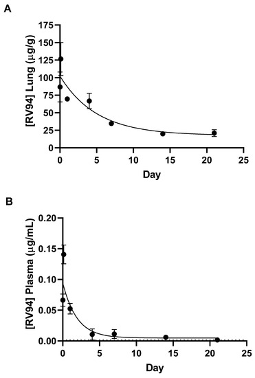 RV94 lung (A) and plasma (B) concentration following a single dose of RV94 DPI administered by nose-only inhalation to healthy rats using a VAG dry powder dispenser. Rats in n = 3 cohorts of n = 10 per cohort were dosed for 20 min, and the average mass of drug product aerosolized was 133 ± 14 mg (equivalent to 116 mg RV94 drug substance). The average RV94 dose delivered at the nose as determined by an inline sampling filter was 4.0 ± 0.6 mg/kg. Data were plotted as mean. Error is SEM; n = 5 for immediately post-dose, and n = 3 for all other timepoints. LOD for lung based on the lowest standard curve standard was 0.3 μg/g. LOQ = 0.0015 μg/mL for plasma. Data were fit using a one-phase exponential decay in GraphPad Prism 9.3. R2 = 0.85 for lung RV94 and 0.68 for plasma RV94.