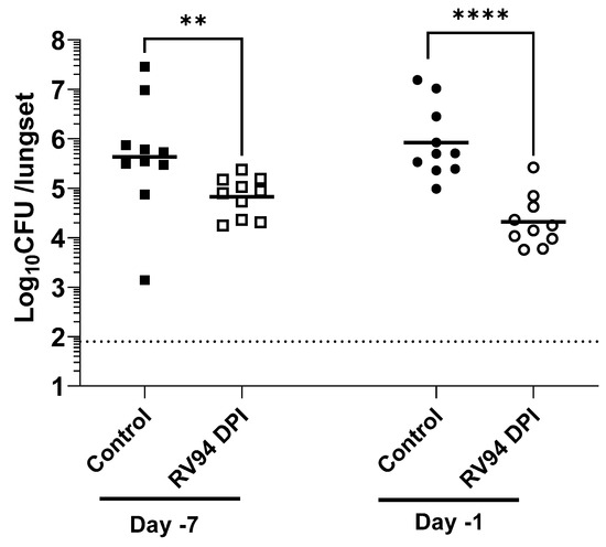 A single dose of RV94 DPI administered 7 days or 1 day prior to challenge demonstrates reductions in lung MRSA titer vs. control in an acute pulmonary MRSA (ATCC BAA 1556; USA300) infection in neutropenic rats. The estimated nose dose of RV94 measured from the sampling filter administered on Day-7 was 3.5 mg/kg and on Day-1 was 5.1 mg/kg. Lungs were excised for CFU enumeration at 48 h after infection. Data were plotted as geometric mean. n = 10 for all groups. LOD = 1.9 Log10CFU/lungset. Statistics are based on Mann–Whitney test; p = 0.009 for Day-7 treatment vs. air sham control, p < 0.0001 for Day-1 treatment vs. air sham control. ** Refers to p < 0.01 and **** to p < 0.0001.