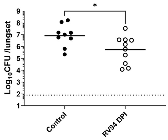 A single dose of RV94 inhalation powder administered 24 h after infection demonstrates a reduction in lung MRSA titer vs. control in an acute pulmonary MRSA (ATCC BAA 1556; USA300) infection in neutropenic rats. The estimated nose dose of RV94 measured from the sampling filter was 8.3 mg/kg. Treatment was administered 24 h after infection, and lungs were excised for CFU enumeration at 48 h after infection. Data were plotted as geometric mean. n = 9 for control and 10 for RV94 DPI. In the control group, one rat succumbed to the infection and died. LOD = 1.9 Log10CFU/lungset. Statistics are based on Mann–Whitney test; p = 0.02. * Refers to p < 0.05.