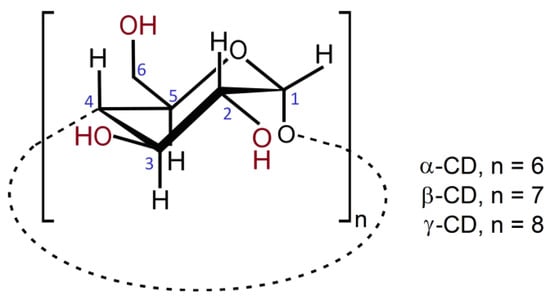 Chemical structure and atom labelling of native cyclodextrins. Hydroxyl groups, the anchoring points for chemical modification to introduce functional groups, are depicted in dark red.