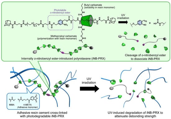 Schematic illustration of internally o-nitrobenzyl ester-introduced photodegradable polyrotaxanes (iNB-PRX) and UV-induced embrittlement of adhesive resin cements containing methylmethacrylate (MMA), 4-methacryloxyethyl trimellitate anhydride (4-META), and iNB-PRX. Reproduced from Matsunaga et al. [] under a Creative Commons Licence.