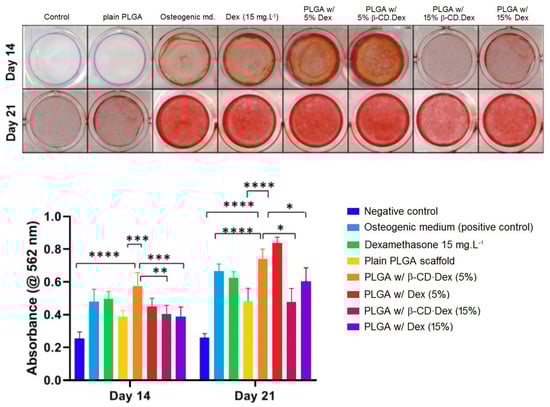 Osteogenic effect of free/β-CD-included dexamethasone. Alizarin red stained wells (top of the figure) show the effect, at day 14, of both pure and β-CD/PLGA scaffold-delivered dexamethasone (Dex) on the induced mineralisation of stem cells from human-extracted deciduous teeth. Quantification of alizarin red S staining (graph at the bottom part of the figure) shows the effect of different concentrations of Dex, as released by the PLGA scaffolds with the pure drug or β-CD·Dex, on the induced matrix mineralisation in the stem cells. Adapted with permission from Daghrery et al. []; copyright ©2020 Elsevier.
