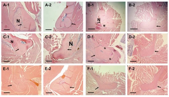 Histology of decalcified rat mandible pairs 24 days after treatments with different compounds. ALN-β-CD·prostaglandin E1 (A-1) vs. HPβCD·prostaglandin E1 (A-2); ALN-β-CD (B-1) vs. HPβCD (B-2); ALN-β-CD·prostaglandin E1 (C-1) vs. ALN-β-CD (C-2); ALN (D-1) vs. saline (D-2); prostaglandin E1 (E-1) vs. ethanol (E-2); saline (F-1) vs. no treatment (F-2). N = new bone. Bar = 0.5 mm. Arrow indicates the approximate site of injection. Reproduced with permission from Liu et al. []; copyright ©2007 Elsevier.