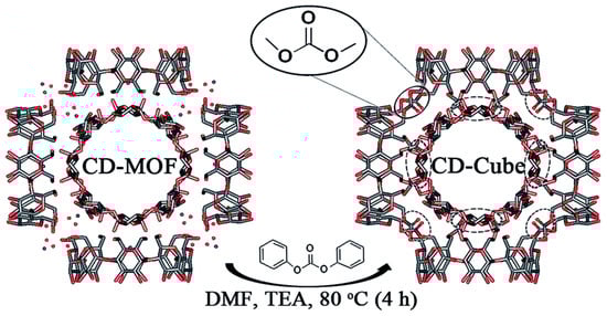 In a recent report, diphenyl carbonate was used as the crosslinking agent for γ-CD-MOFs; furthermore, triethylamine (TEA) was used as a catalyst, allowing the crosslinking reaction to be completed in as little as 4 h (Figure 6) []. The resulting particles retained the cubic shape of the original γ-CD-MOFs particles that formed them, but were insoluble in water and able to carry a high load of actives.