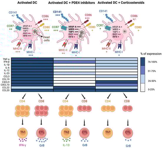 The effects of PDE4 inhibitors on maturation and immune functions of DCs has been investigated in a number of studies revealing the modulation rather than the suppression of the proinflammatory and T-activating capabilities of DCs. These changes are detailed in the following paragraphs and depicted in Figure 3.