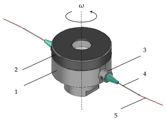 Custom-designed centrifugal spinning rotating head: 1—lower part, 2—cap, 3—thread-to-lure connector, 4—needle, and 5—polymer jet.