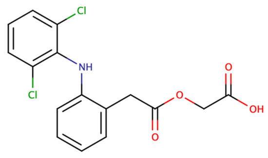 Aceclofenac (Figure 2) was provided by Richter Gedeon Plc. (Budapest, Hungary), poly (vinyl-pyrrolidone) (PVP K90, Kollidon K90) was obtained from Sigma Aldrich (Merck, Darmstadt, Germany), and ethanol (EtOH, 96%) was from Chemical Company (Iasi, Romania). Methanol, acetonitrile, and orto-phosphoric acid (85%) used during the liquid chromatographic measurements were HPLC grade, obtained from Merck (Darmstadt, Germany). Ultrapure distilled water was prepared in-house by a MilliQ water purification system. Potassium dihydrogen phosphate and sodium hydroxide used throughout the in vitro dissolution studies were obtained from Merck (Darmstadt, Germany).