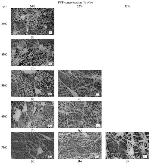 SEM images of PVP fiber mats spun at different rotation speed from 20% w/w (a–e), 25% w/w (f–h), and 30% w/w (i) PVP solution concentration at 100× magnification.
