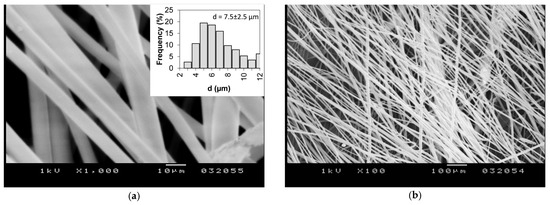SEM images of the aceclofenac-loaded PVP fiber mat obtained by centrifugal spinning: (a) at 1000× magnification with an inset showing a histogram of the fiber size; (b) at 100× magnification.