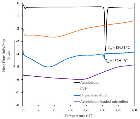 Overlaid thermograms of the active substance, the fiber-forming polymer, their physical mixture, and the obtained fiber mats are presented in Figure 5. The thermogram of aceclofenac is characterized by the presence of a single sharp, endothermic peak at 154.81 °C, indicating the melting of the crystalline phase. The obtained values are in good correlation with the values described earlier in the literature [37]. The DSC thermogram of PVP K90 is characteristic of an amorphous, hygroscopic substance, with a broad endothermic event around 100 °C, indicating the dehydration of the polymer. In the thermogram of the physical mixture (prepared from the same amount of polymer and aceclofenac as in the case of the microfibers), the overlay of the thermograms of the two components can be observed. The endothermic peak of the active can clearly be observed in this thermogram at 152.91 °C, indicating its crystalline form. The melting point depression of aceclofenac in the physical mixture can be explained by possible interactions between the PVP and aceclofenac. The smaller endothermic peak intensity of the active refers to its proportion in the physical mixture. On the other hand, the DSC thermogram of the prepared microfibrous mats can only be characterized by a broad endothermic peak. The endothermic melting peak of the active substance completely disappears from the thermogram of the microfibers, indicative of the crystalline to amorphous transition of aceclofenac through fiber formation.