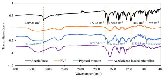 FT-IR spectra of pure aceclofenac (black), PVP (orange), physical mixture (blue), and the aceclofenac-loaded PVP microfibers (purple).