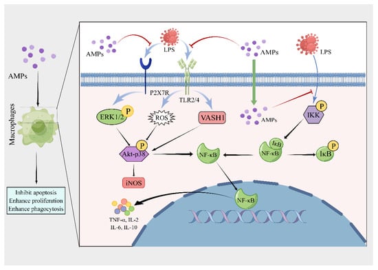 The regulatory mechanism of AMPs on macrophages (Drew in Figdraw.). AMPs inhibit apoptosis of macrophages, and enhance proliferation and phagocytosis of macrophages. AMPs inhibit LPS-induced inflammatory responses through P2X7R receptors or TLR2/4 receptors. AMPs inhibit Akt-p38 phosphorylation and NF-κB activation in different pathways induced by LPS through different receptors. Moreover, AMPs enter macrophages directly to block IKK phosphorylation, inhibit NF-κB pathway activation and production of the inflammatory factors.