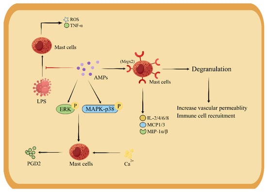 The regulatory mechanism of AMPs on mast cells (Drew in Figdraw.). AMPs induce an increase in Ca2+ concentration in mast cells through ERK and MAPK-p38 phosphorylation. By acting on the Mrgx2 receptor, mast cells release inflammatory mediators and cause degranulation, thus increasing vascular permeability, and recruit immune cells. AMPs directly inhibit production of ROS and TNF-α in mast cells induced by LPS.