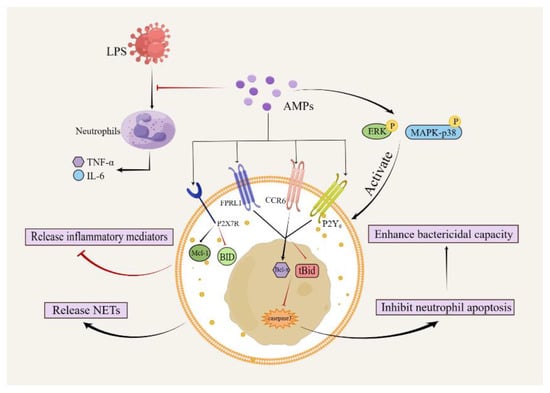 The human cathelicidin family member AMP LL-37 has an immunomodulatory effect on neutrophils [184]. LL-37 is a potent inhibitor of human neutrophil apoptosis and signaling pathways through P2X7R- and G-protein-coupled receptors (other than the formyl peptide receptor-like-1 molecule) (Figure 6). This process involves the modulation of Mcl-1 expression, the inhibition of BID and procaspase-3 cleavage, and the activation of phosphatidylinositol-3 kinase [185]. LL-37 promotes neutrophils to independently form neutrophil extracellular traps (NETs) and enhances the resistance of NETs to the degradation of Staphylococcus aureus nuclease (Table 6) [186,187]. Activated neutrophils can release NETs in response to a variety of stimuli. NETs have two important functions: capturing and destroying microorganisms including viruses, fungi, bacteria, and protozoa [188]. LL-37 enhances production of IL-8 under the control of MAPK p38 and ERK and induces phosphorylation of p38 and ERK. LL-37 stimulates ROS generation, most likely via NADPH oxidase activation and intracellular Ca2+ mobilization. In addition, LL-37 induces both mRNA expression and protein release of α-defensins, known as human neutrophil peptides 1–3 [189]. Finally, LL-37 significantly inhibits release of proinflammatory cytokines in neutrophils and expression of IL-1β, TNF-α, soluble trigger receptors, and damage-associated molecular patterns on triggering receptor expressed on myeloid cells-1 (TREM-1) in plasma and peritoneal fluid [190,191].