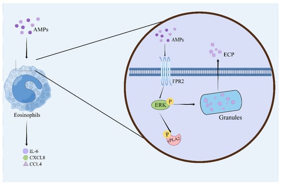 In addition, AMPs participate in the immune regulation and inflammatory processes [8]. AMPs regulate proinflammatory and anti-inflammatory responses mainly by modulating signaling pathways, directly or indirectly recruiting effector cells, including phagocytes, enhancing intracellular and extracellular bactericidal effects, and promoting macrophage differentiation and dendritic cell maturation. AMPs can also activate immune cells, promote immune cell proliferation, promote the secretion of immunoglobulins and cytokines, promote wound healing, regulate autophagy and apoptosis, and perform other functions in the host immune system [9]. In this study, evidence related to the mechanisms of different AMP-mediated regulatory functions in immune cells, including those of macrophages, monocytes, lymphocytes, mast cells, dendritic cells (DCs), neutrophils, and eosinophils, is reviewed.