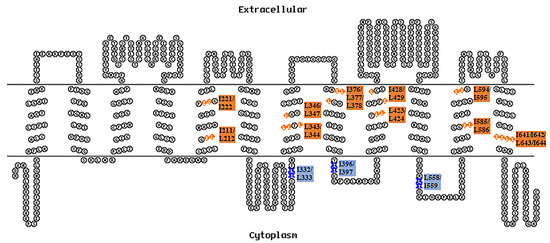 Location of different dileucine motifs within the sequence of OATP1B1. Amino acid residues along the transmembrane helices were selected according to the Kyte–Doolittle hydrophobicity scale. The topology model of OATP1B1 was generated with the web-based service TOPO2 (https://www.cgl.ucsf.edu/Overview/software.html#topo2 (accessed on 12 March 2020)). Dileucine motifs at intracellular loops are labeled as blue stars, while those at the transmembrane helices are indicated as orange diamonds.