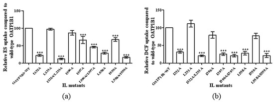 The double-leucine motifs within the transmembrane domains were analyzed in a similar way. Although quite a few single- and double-mutants showed significantly reduced uptake function (Figure 3), only the activity of two DLMs, i.e., I376A/L377A and I642A/L643A, decreased significantly compared to the uptake function derived from the calculated additive effect of the corresponding single-mutants (Table 2 and Table 3). Moreover, the same trend was observed for both intracellular and transmembrane residues with the uptake of ES or DCF; hence, DCF was used for the uptake function analysis in our following studies.