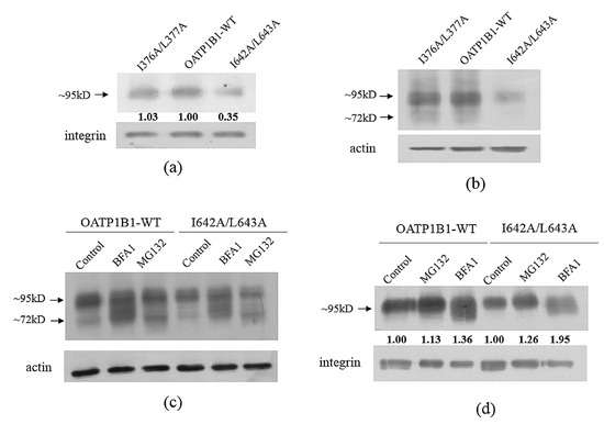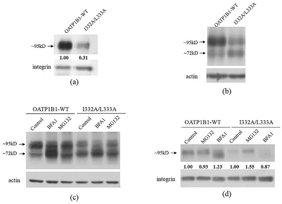 The protein expression of the I332A/L333A double-mutant. (a) Cell surface expression of OATP1B1 and I332A/L333A double-mutant. (b) Total protein expression of OATP1B1 and I332A/L333A. Cells expressing OATP1B1 wild-type or the mutant were biotinylated and lysed, and the biotin-labeled proteins were precipitated with streptavidin beads. In the case of total protein expression, cells were directly lysed with RIPA buffer. The proteins were then denatured and separated by SDS-PAGE, followed by Western blotting, and detected with anti-HA antibody (1:1000 dilution) or probed with integrin (membrane proteins) or actin (total proteins) antibodies as the loading control. (c) Total protein expression of OATP1B1 and I332A/L333A after the treatment with proteasome inhibitor MG132 or lysosome inhibitor BFA1. (d) Cell surface expression of OATP1B1 and I332A/L333A after MG132 or BFA1 treatment. Cells were treated with 10 μM MG132 or 100 nM BFA1 for 12 h, and the proteins were extracted and analyzed as described above. The intensity of the bands for cell surface transporter proteins was analyzed with Image J, adjusted with the loading control, and shown under the corresponding samples. The band intensity of wild-type OATP1B1 is designated as 1 in (a), while the band intensity of the untreated wild-type OATP1B1 or I332A/L333A is designated as 1 in (d).