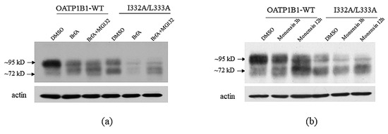 Treatment of I332A/L333A double-mutant with Golgi transport blockers. (a). Cells expressing the OATP1B1 or the I332A/L333A double-mutant were treated with Brefeldin A. (b). Cells expressing the OATP1B1 or the I332A/L333A double-mutant were treated with monensin. Cells expressing OATP1B1 or I332A/L333A were treated with 2 μM BrfA for 16 h or 1 μM monensin for 3 and 12 h. Total proteins were extracted and subjected to analysis.