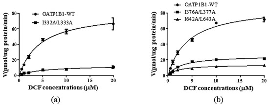 Although the change of the protein level on the cell surface may explain the dramatically reduced uptake by I332A/L333A and I642A/L643A, the mutation of these motifs may also alter the interaction of the transporter with the substrates; hence, we investigated the concentration-dependent transport of DCF by these mutants and found that I332A/L333A only affected the Vmax of the transporter (Figure 8a). However, when the function of the double-mutant was normalized with its cell surface protein level, the Vmax of the mutant was similar to that of OATP1B1-WT (Table 4), suggesting that the reduced function of the mutant was mainly due to the decreased level of the transporter. As for the DLMs at the TMs, both I376A/L377A and I642A/L643A exhibited a reduced Km (though not statistically significant for I376A/L377A) and significantly decreased Vmax (Figure 8b and Table 4). Moreover, even when the Vmax of I642A/L643A was normalized with the membrane protein level of the mutant, the value of the turn-over rate was still significantly lower than that of the wild-type transporter (Table 4), which indicated that this DLM not only affects the stability of OATP1B1, but also is involved in the interaction between the transporter and the substrates. When the overall transport efficiency was characterized by Vmax/Km, it was shown that all three mutants exhibited decreased transport efficiency compared to that of wild-type OATP1B1, with I376A/L377A exhibiting the most-dramatic reduction (Table 4).