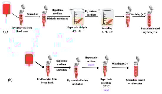 Regarding the hypotonic dilution method, a suspension of 70% (v:v) of packed erythrocytes is prepared in hypotonic buffer containing the drug and incubated at 4 °C. Next, hypertonic buffer is added to this mixture, and a resealing step is performed at 37 °C in order to restore the tonicity and incubation. Final washings with isotonic medium are also included to remove the non-entrapped drug excess.