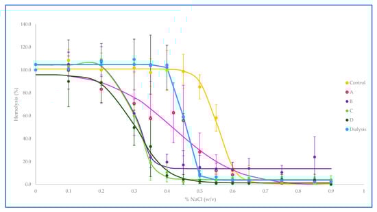 The osmotic fragility of native erythrocytes and stavudine-loaded carrier erythrocytes was determined according to Dacie’s method as described elsewhere [20]. Carrier erythrocytes were incubated in the presence of various concentrations of NaCl (0% to 0.9%), and the released hemoglobin was measured at 418 nm (spectrophotometer 8453 Agilent, Santa Clara, CA, USA). Osmotic fragility curves were fitted using GraphPad Prism software (San Diego, CA, USA), and an osmotic fragility index was defined for native and stavudine-loaded erythrocytes. This index was calculated as the NaCl concentration (%) necessary for obtaining 50% of hemolysis according to the curve equation.