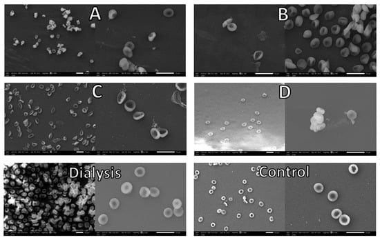Images obtained with a Jeol IT500 Scanning Electron Microscope (Akishima, Tokyo, Japan) were analyzed for a qualitative evaluation of changes in morphology, and quantitative analysis of erythrocyte sizes was performed with ImageJ software version 1.53 (Bethesda, MD, USA).