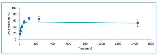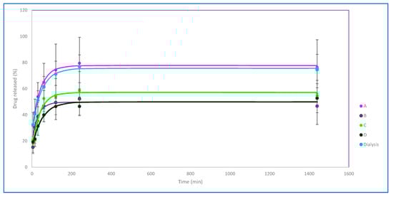 The A conditions, which combine the least resealing time and hypertonic buffer volume, result in a higher release rate and a high maximum of almost 80% in the period studied, which is reached at 6 h. These results are consistent with other results already observed for these conditions, while the curve profiles observed for B, C, and D are similar, maintaining about 50% of the encapsulated drug inside throughout the entire interval studied.