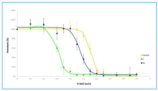 Control and loaded erythrocytes with conditions C and Nc osmotic fragility curves. The figure shows the hemolysis measured (mean ± S.D.) when exposed to different NaCl concentrations. Percentage of hemolysis is estimated from the signal obtained from incubation with pure water (100% hemolysis).