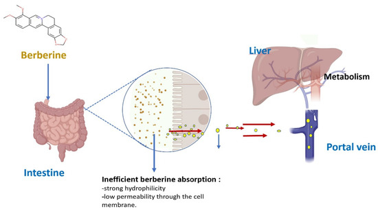 Several barriers have been identified that hamper BBR oral administration, namely: (i) the formation of self-aggregates in the stomach acidic environment and the small intestine; (ii) interaction with multidrug transporter P-glycoprotein [42]; and (iii) hepatobiliary re-excretion due to the existence of the hepatoenteral circulation process [32,43].