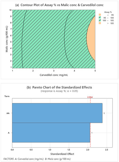 We conducted a DoE to optimize the two critical parameters of the final formula. One critical parameter is pH since it must be suitable for paediatrics. pH amounts <2.0 are not appropriate for them [43,44]. The other critical parameter is the CARV assay, which ensures the correct dose. Our DoE study results verified that malic acid concentration did not affect the CARV assay response within the CARV concentration range studied (1.0 to 5.0 mg/mL). Working with a CARV concentration >5.0 mg/mL may be necessary; however, more assays would be required. By contrast, malic acid and CARV concentrations significantly affected the pH of the formula, and both concentrations interacted with each other (Figure 3).