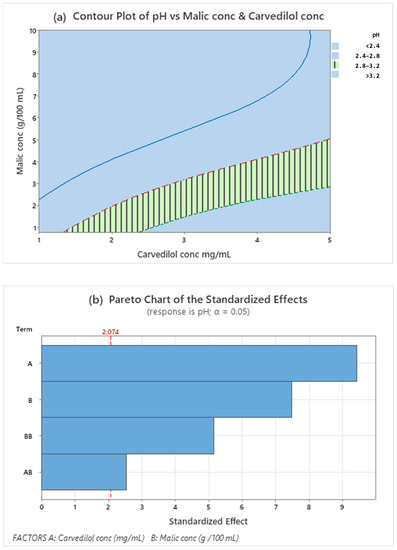 Regarding the pH response, the interval studied indicates that the factors are significant and should be optimized (Figure 2a,b). As shown in the Pareto chart (Figure 2b), both malic acid and CARV concentrations and their interactions significantly influence pH response.