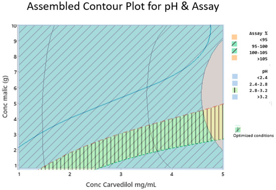 Given the desirability of the CARV solution, we could identify relationships between the examined factors and response values, thereby creating a design space and finding optimal conditions to prepare the formulation. We assembled the contour plot of the CARV assay and pH areas to obtain an optimal design space (Figure 3). In Figure 3, optimal conditions are shown at the intersection of specifications, oblique and vertical lines, pH (2.8 to 3.2), and CARV assay (95.0–105.0%).