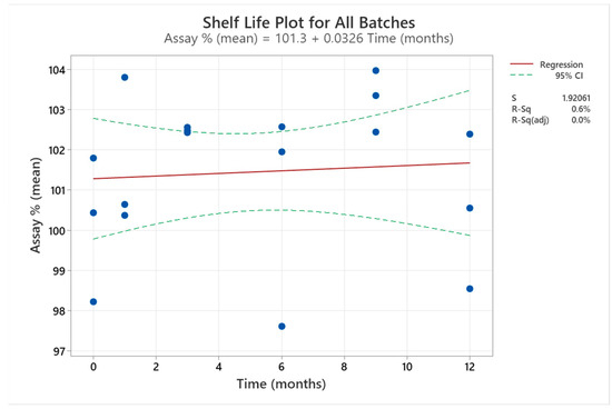We included the F7_1_1 formulation in the stability study and prepared three batches. Every batch was analysed in duplicate at each stability time. The poolability of results from the three batches, batch × time interaction, was previously verified with a significance level of 0.477. Since the p-value is >0.25, the results data from the three batches can be combined for a single shelf life.