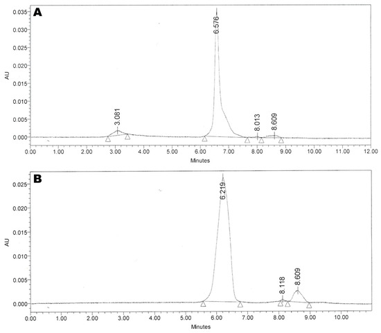 HPLC profiles of (A) 0-point and (B) 6 months AGT 4 °C stability samples. Triangles in the profiles denote points of automatic integration.