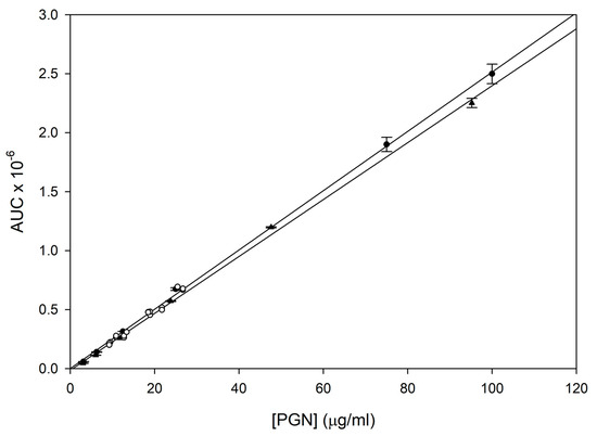 PGN standard curves comprising PGN alone or PGN in the presence of 20-fold dilute plain ELIP dispersed in 80% ethanol were linear from 3 to 100 µg/mL (Figure 4). Y-intercepts were not significantly different from zero. AGT 0-point sample dilutions (25× and 50×) clustered around the curves, indicating that they obeyed the same linear relationship as the standards.