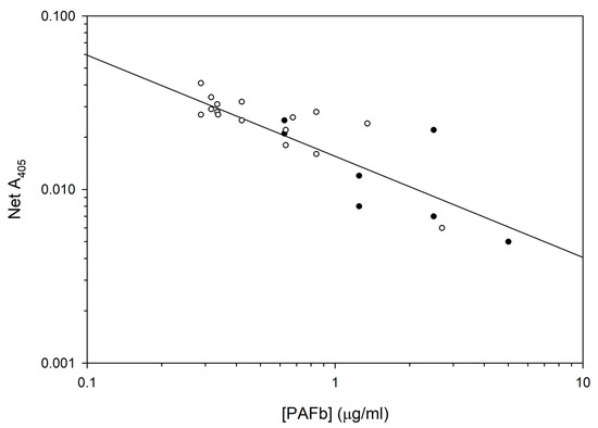 PAFb inhibition ELISA standard curve (solid circles) with 16 sample points from 4 °C study, showing superimposibility, indicating identity of ELIP-conjugated PAFb with the PAFb standard. Log y = −0.583 log x − 1.809; r = 0.705.