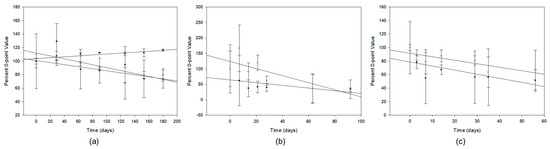 Trending parameter regressions. (a) 4 °C data. Closed circles, liposome diameter; open circles, echogenicity; inverted triangles, particle number. (b) 24 °C data. Closed circles, conjugation efficiency; open circles, targeting efficiency (specific avidity). (c) 37 °C data. Closed circles, conjugation efficiency; open circles, PGN loading efficiency. Data points are mean percent 0-point values ± SD, n = 4–5 as specified in Table 1.