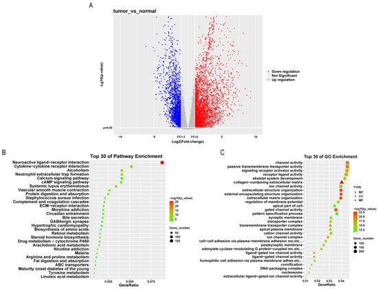 Screening and enrichment analysis of DEG. (A) DEG volcano map. (B) GO enrichment analysis. (C) KEGG enrichment analysis.