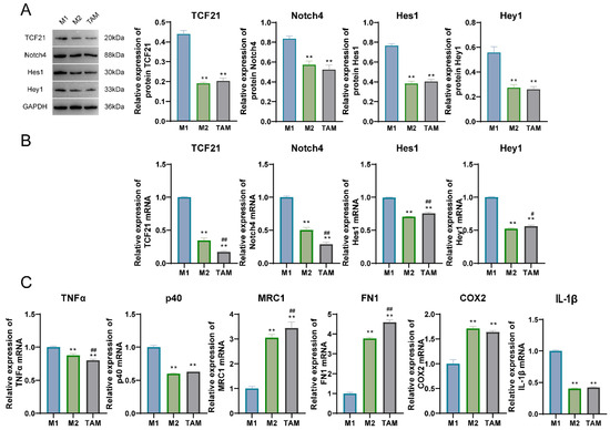 The expression levels of TCF21, Notch4, Hes1, Hey1, TNF-α, p40, and IL-1β were decreased in M2 and TAM, while the expressions of MRC1, FN1, and COX2 were increased compared with M1. (A) The expression level of TCF21, Notch4, Hes1, and Hey1 proteins was detected by Western blot. (B) The expression level of TCF21, Notch4, Hes1, and Hey1 mRNAs was detected by qPCR. (C) The expression level of TNFα, P40, MRC1, FN1, COX2, and IL-1β mRNAs was detected by qPCR. Note: ** p < 0.01 represents a significant statistical difference vs. M1; # p < 0.05 ## p < 0.01 represent a significant statistical difference vs. M2.