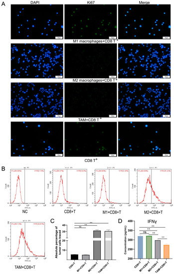 Impacts of macrophage polarization on T cell viability and tumor killing. (A) Expression of cytokine Ki67 in the M2 + CD8+T cell group and TAM + CD8+T cell group was greatly decreased, implying that TAMs polarized to the M2 type and T cell viability was weakened. (B,C) Flow cytometry result showed that compared with the CD8+T cell group, the M2 + CD8+T cell group and TAM + CD8+T cell group was weakened in killing tumor cells and produced a significant effect. (D) ELISA result showed the content of cytokine IFN-γ in the M2 + CD8+T cell group and TAM + CD8+T cell group decreased. Note: ns represente no significant difference; ** p < 0.01 represents a significant statistical difference.