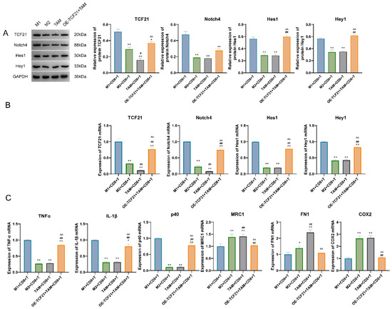The regulatory effect of TCF21 on Notch4. (A) The expression of TCF21, Notch4, Hes1, and Hey1 mRNAs was detected by qPCR. (B) The expression of TCF21, Notch4, Hes1, and Hey1 proteins was detected by Western blot. (C) TCF21 acts with Notch4 to regulate TNF-α, P40, MRC1, FN1, COX2, and IL-1β. Note: * p < 0.05 and ** p < 0.01 represent a significant statistical difference vs. NC; # p < 0.05 and ## p < 0.01 represent a significant statistical difference vs. OE-TCF21.
